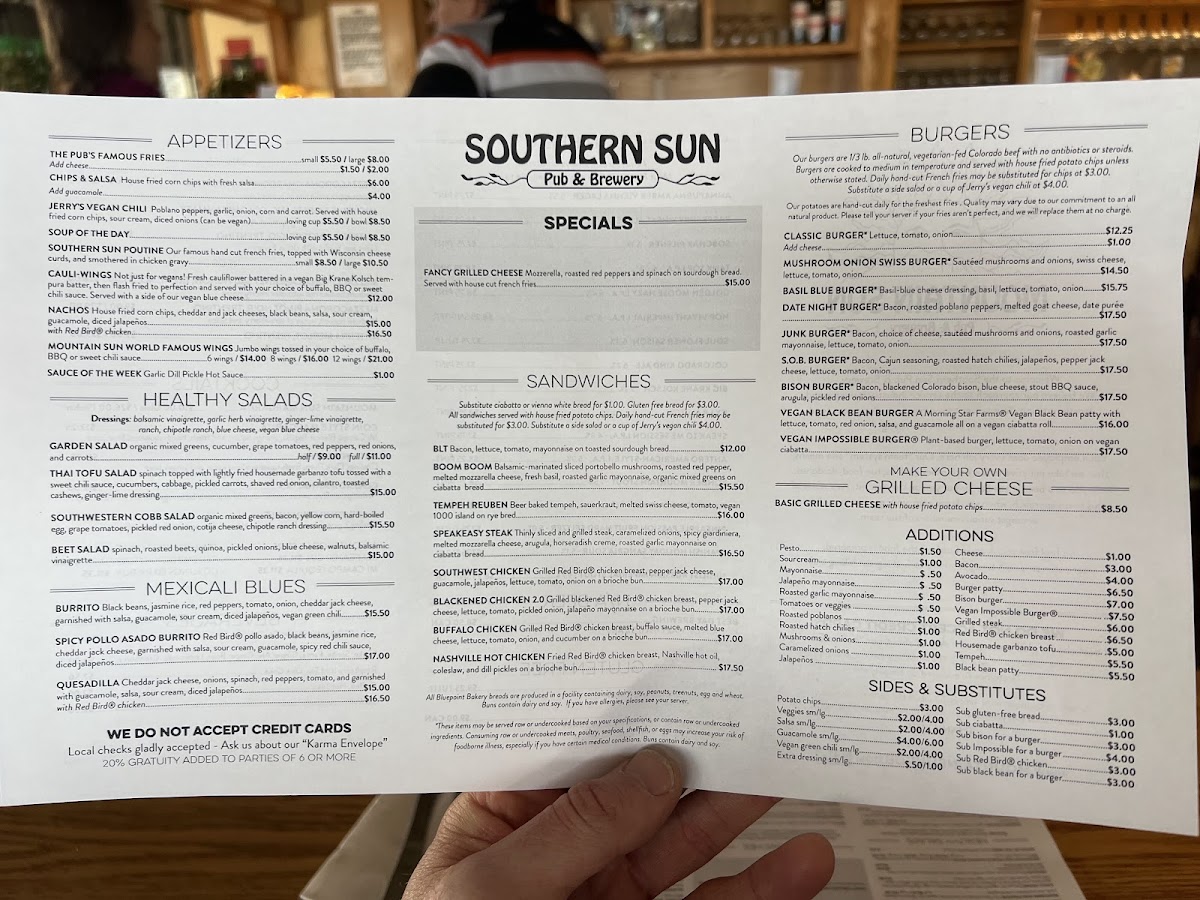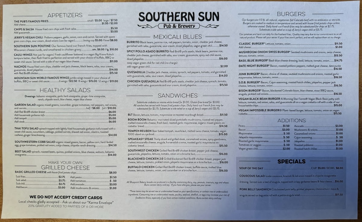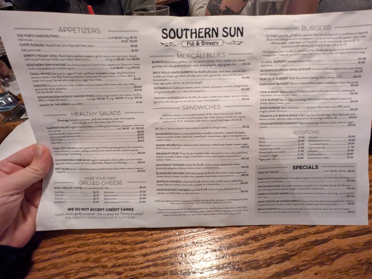 The menu also caters to diverse tastes, featuring thoughtful vegan options like the hearty vegan chili and cauliflower wings, which invite customization with hot sauce to satisfy various spice preferences. Classic pub staples like the Philly cheesesteak and crispy chips & salsa round out the selection. The warm, welcoming staff and casual ambiance make Southern Sun an inviting spot to enjoy robust flavors alongside finely crafted brews, despite the cash-only policy.